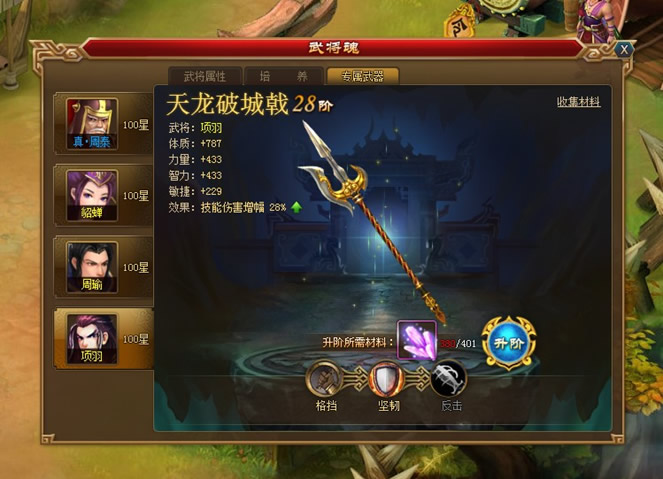 升阶材料可在挑战天命将星中获得,专属武器每升一阶,武将的技能伤害属性效果便增加一些,专属武器提升至10阶、20阶、30阶时,就可依次激活专属武器的三个技能了。