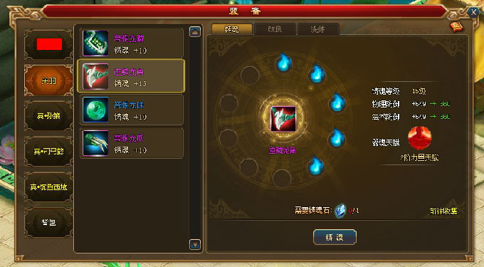 对魂器装备进行铸魂培养需要一定数量的铸魂石,铸魂等级越高,所需的铸魂石就越多。当镶满该魂器装备界面上的所有铸魂石时,如果拥有对应的魂器装备升阶图纸,就可以升阶,提升铸魂等级。(铸魂石和升阶图纸可在七星封魔塔副本获得!)