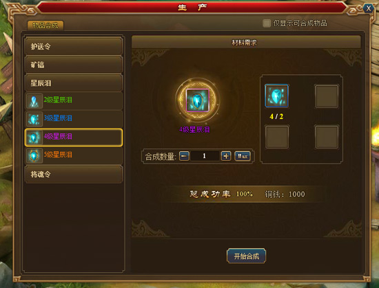 打开生产,在这里,可以对护送令、矿镐、星辰泪、将魂令四种物品进行合成,两个低级护送令合成一个中级护送令,两个中级护送令合成一个高级护送令……以此类推,矿镐、星辰泪以及将魂令也一样,每次合成需要消耗1000银币。