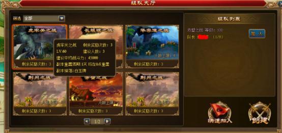 2、目前共有八个组队副本,分布为:虎牢关之战(60级)、长坂坡之战(65级)、华容道(70级)、截江救阿斗(75级)、赤壁之战(75级)、荆州之战(80级)、上方谷之战(85级)、夷陵之战(90级);