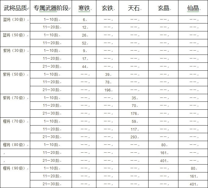 激活专属武器的武将技能需要用寒铁、玄铁、天石、玄晶、仙晶五种升阶材料。(各等级武将消耗的材料清单详见文章尾部)